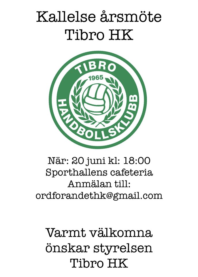Välkomna på årsmöte, måndagen den 20/6 kö: 18:00 i sporthallens cafeteria Anmäl till ordforandethk@gmail.com Tibro HK 11 maj 2022 0kommentarer